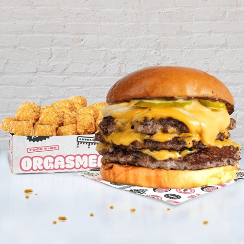 Ontdek de ORGASMEAT 6-Patty Smash Burger: ZES overdadige smashed steaks, omhelsd door een zachte brioche bun, verrijkt met vijfdubbele cheddar, huisgemaakte saus, zoete uien en pittige augurken. Een majestueuze berg van smaak die jou bij elke hap een overweldigende culinaire zegeviering belooft!